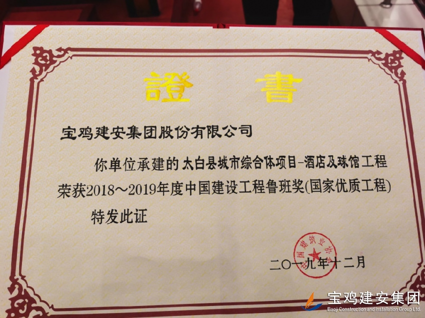 睽違三十載,喜開二度梅。12月10日,從北京會議中心傳來喜訊,由寶雞建安集團承建的太白縣城市綜合體項目—酒店及球館工程,在全國建筑行業(yè)精品工程最高獎項大比拼的激烈角逐中,力挫群雄,脫穎而出,最終摘得2018--2019年度中國建設工程魯班獎(國家優(yōu)質工程)桂冠,這也使寶雞建安集團成為繼法門寺重建工程獲得寶雞第一個建筑魯班獎后,時隔近30年再次奪得“魯班獎”的企業(yè),從而書寫了建筑行業(yè)頂級獎“梅開二度”的傳奇!