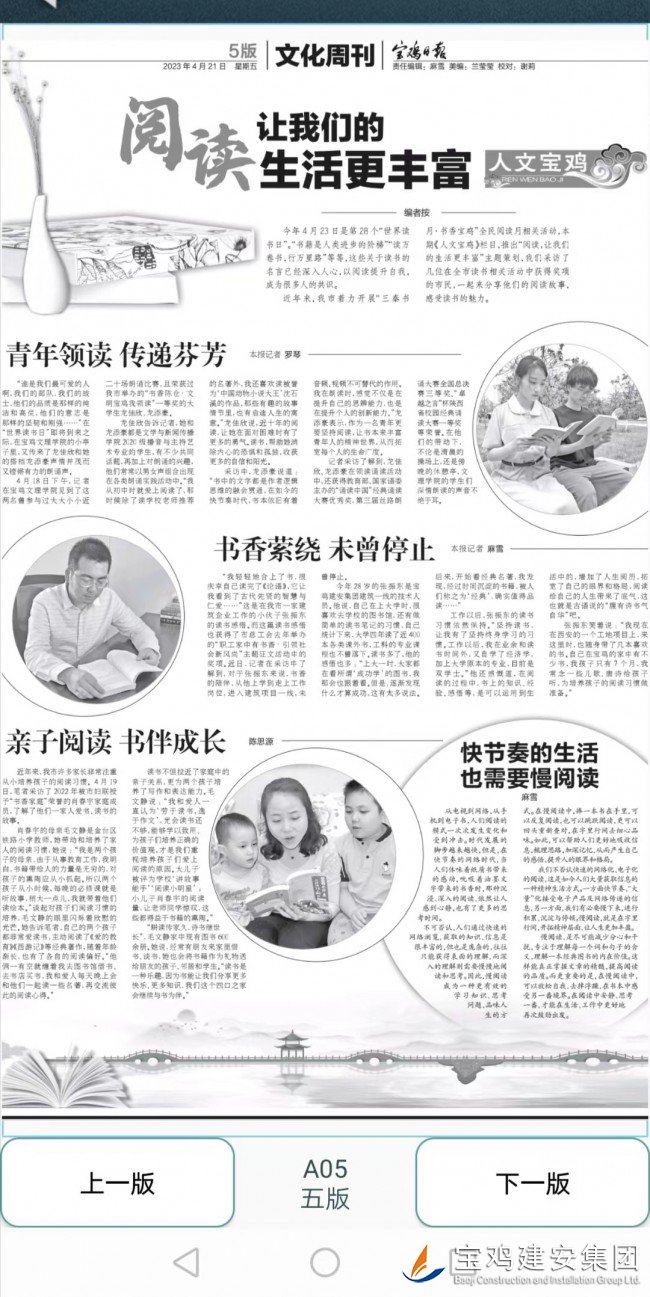 編者按:在第28個世界讀書日到來之際,《寶雞日報》社策劃了讀書專版,鑒于寶雞建安集團工會長期堅持舉辦的“書香企業(yè)”征文活動在社會的影響力與美譽度,記者來電提出采訪意向,公司工會極力舉薦了來自基層一線熱愛閱讀并多次參與讀書征文的技術(shù)人員張振東同志。5月21日,《寶雞日報》發(fā)表了這篇小專訪,現(xiàn)予轉(zhuǎn)發(fā)。